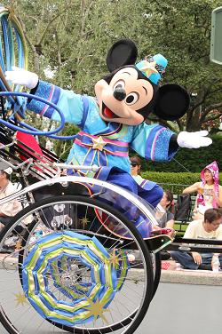| 時間不定期のパレードを見られました。 1フロートのみですが、ミッキーとドナルドがこっちを向いてくれました♪ |